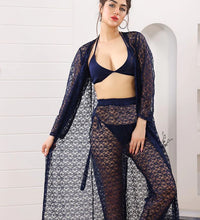 • Coordinated 4-Piece Ensemble: Includes a triangle halter bralette, matching G-string, high-waisted sheer lace trousers, and a floor-length open-front lace robe.