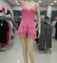 This playful and feminine two-piece set features a vibrant pink camisole with delicate lace-trimmed cups and a tiered ruffle bodice. Paired with matching high-slit polka-dot shorts, it offers a youthful and comfortable silhouette perfect for lounging.